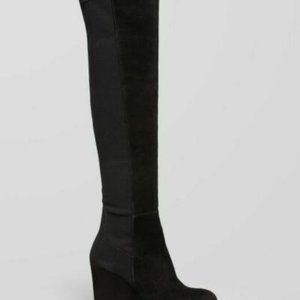 Stuart Weitzman tall over the knee wedge / platform boots, black suede, women’s size 8.5M. In very good pre-owned condition, retail price $698. Heel 3.75”, circumference 14.5”. A sleek stretch back panel gives these suede boots a snug, sexy fit. Made in Spain.