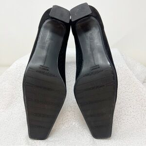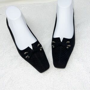 Stuart Weitzman suede perforated kitten heels in black suede . Size 9 genuine suede upper leatherr lining 1.5 kitten heels in black, cushioned insole made in spain , preowned in excellent condition!