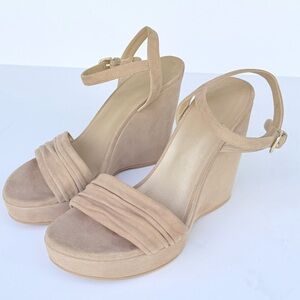 Stuart Weitzman Sundraped Tan / Beige Suede Wedge Ankle Strap Sandals 8.5