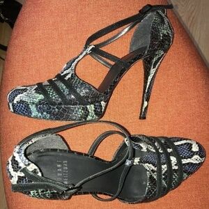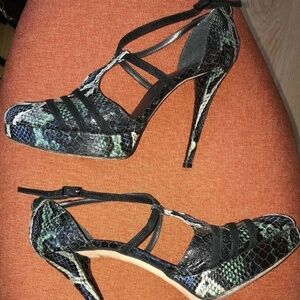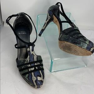This is an incredible pair of Stuart Weitzman Sz 10M Green Blue Snakeskin High Heel Stilletto T Strap Shoes