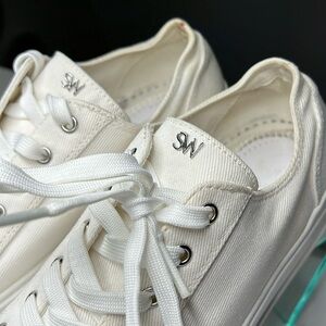 This is a great pair of Stuart Weitzman Sz 38 White Canvas Tennis Shoes Sneakers. Worn just a couple of times. The interior original sole had been removed, but you can certainly replace with your own inner sole. Minor scuffs and spots mostly on the interior. No odors.