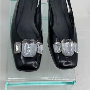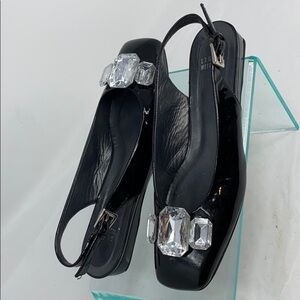 This a beautiful pair of Stuart Weitzman Sz 6.5 Black Patent Leather Sling back Flats with three large crystals on the vamp of each. Low covered 1” low wedge heel. One of the crystals on the right black shoe has a bit of wear to the silver undertone, the silver came off the bottom of the crystal, but the actually stone is in very good condition. Adjustable back strap. A few minor scuffs due to normal wear. Lightly padded leather inner sole. No slip logod outer sole.
