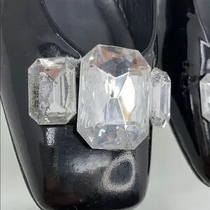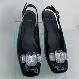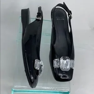 This a beautiful pair of Stuart Weitzman Sz 6.5 Black Patent Leather Sling back Flats with three large crystals on the vamp of each. Low covered 1” low wedge heel. One of the crystals on the right black shoe has a bit of wear to the silver undertone, the silver came off the bottom of the crystal, but the actually stone is in very good condition. Adjustable back strap. A few minor scuffs due to normal wear. Lightly padded leather inner sole. No slip logod outer sole.