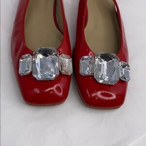 This a beautiful pair of Stuart Weitzman Sz 6.5 Red Patent Leather Sling back Flats. Beautiful bright red color with three large crystals on the vamp of each. Low covered 1” low wedge heel. One of the crystals on the right red shoe has a bit of wear to the silver undertone, the silver came off the bottom of the crystal, but the actually stone is in very good condition. Adjustable back strap. A few minor scuffs due to normal wear. Lightly padded leather inner sole. No slip logod outer sole.