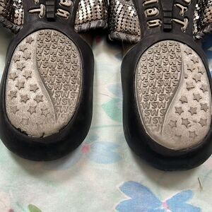 Good condition small metal discs are all there and secure. Heel soles have a little wear. Footbeds have some prints not severe. No major flaws.