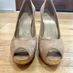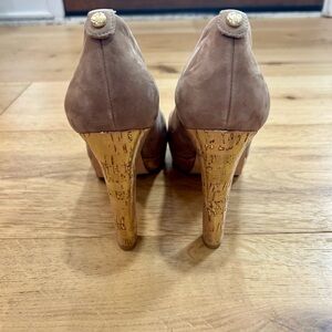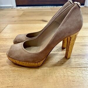 Chic tan suede heels. Perfect for versatile styling. Elevate your look effortlessly.