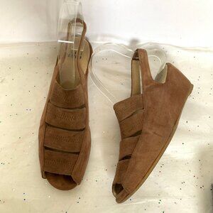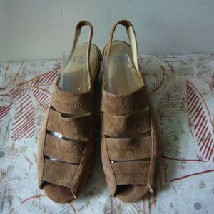 Very Good condition! Very classic style of a suede covered wedge and elastic straps across the top. Really soft suede in a nice tan makes for a perfect neutral. Flexible rubber sole. The Suede is discolored in some areas on heel. Not obvious. Slip right on easily, simple style.