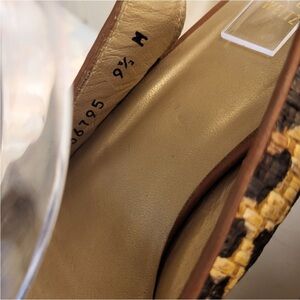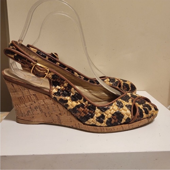 Stylish Stuart Weitzman wedges. Tan and black woven design. Cork wedge heel. Adjustable strap for comfort.