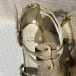 Stuart Weitzman Taupe Snakeskin Embosse Leather Open Toe Kitten Heel 7.5M