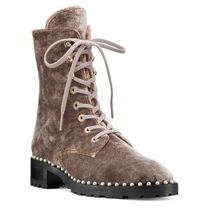 Stuart Weitzman Taupe Velvet Allie Pearl Combat Bootie in Desert Rose