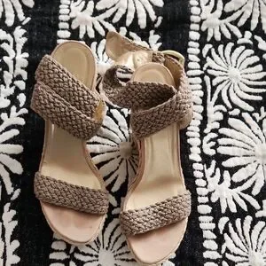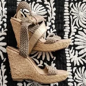 Braided espadrille wedge with woven straps and ankle ties. Gold-tone buckle detail. Neutral taupe color for easy pairing. Lightweight feel with secure fit.