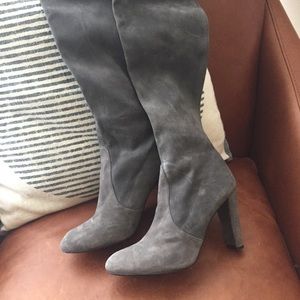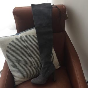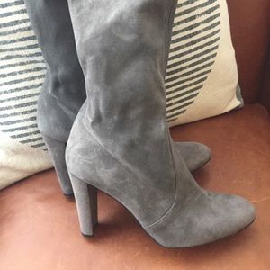 Purchased these directly from Stuart Weitzman. I no longer have the original box after an LA to NY move but can send with original receipt ($850 w/tax) and dust bag. These are beautiful and have only been worn once - there are zero signs of wear on suede, wear only minimally visible on sole. See pictures. Feel free to ask questions or for additional photos!! 3.25" heel, approx 24" shaft height and 14" shaft circumference. Color is charcoal suede. Link for more details and reviews in comments