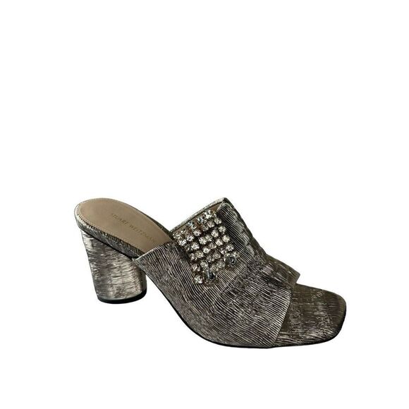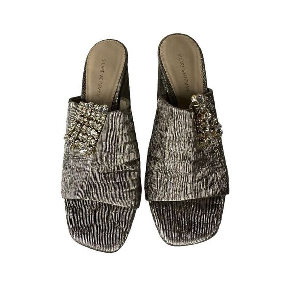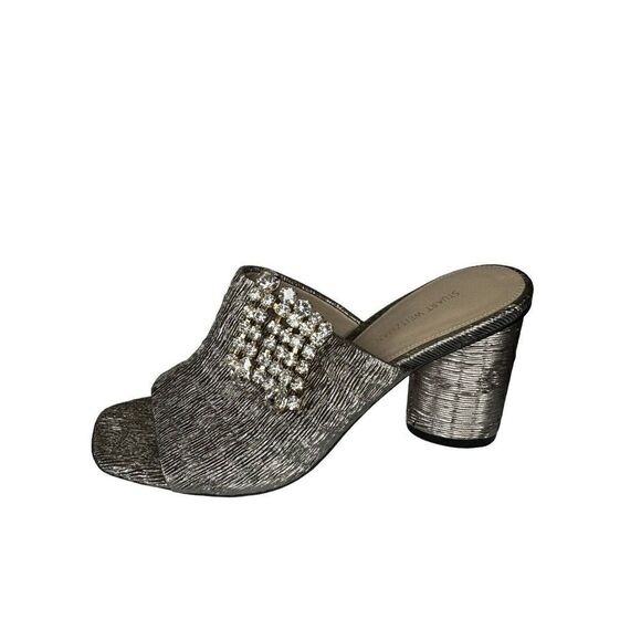 Stuart Weitzman Theone Argento Silver Pleated Lurex Block Heel Slides sz 7 m