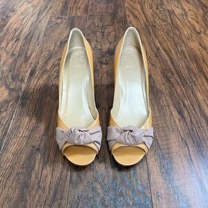 Stuart Weitzman • Turalu pumps heels tan patent leather grosgrain knot peep toe