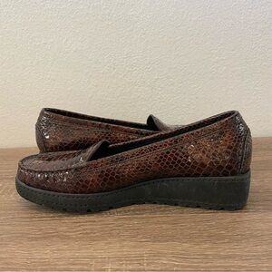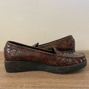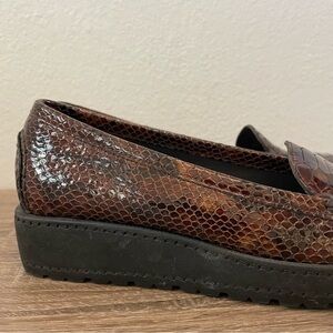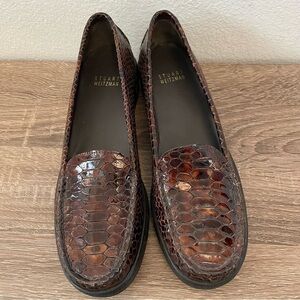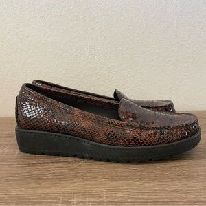 Embossed snakeskin platform loafers from Stuart Weitzman. These vintage shoes are amazing!! In excellent preowned condition; no visible flaws. Minimal signs of wear. Size 6.5 NARROW.