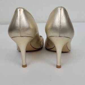 Stuart Weitzman Vintage Gold Lace Peep Toe Leather Sole Heel Made in Spain. Size 8 Women's.