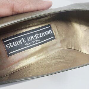 Women's vintage olive green leather heels or pumps by Stuart Weitzman, size 7. Heel height measures at approximately 2.5". Excellent pre-owned vintage condition; some wear inside and on bottom soles. Minor scuffing on sides from storage.