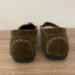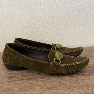Gorgeous deep green pointed toe vintage loafers from Stuart Weitzman with a fun green jewel accent. Size 6.5 SS (Super slim, so these are narrow!) and in excellent preowned condition. No visible flaws.