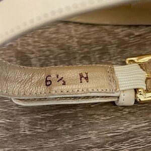 These vintage wedge sandals from Stuart Weitzman are unreal cute. The upper is a translucent rubber material. Bow on the peep toe with a cute tortoise shell style buckle. Buckle strap around the back of the heel. These are in great preowned condition; there is a bit of damage on the right heel (see last pic) but this isn't visible when you're wearing them and doesn't affect wear. This vintage pair has SO much life left!! Size 6.5 NARROW.