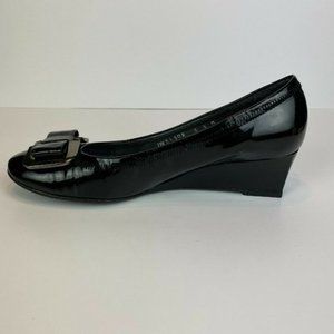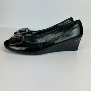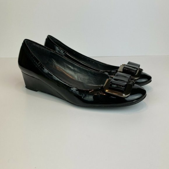 Stuart Weitzman Wedge Heels 5.5 Black Patent Leather Silver Bow Office Career Date Night Women's