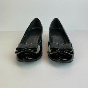 Stuart Weitzman Wedge Heels 5.5 Black Patent Leather Silver Bow Office Career