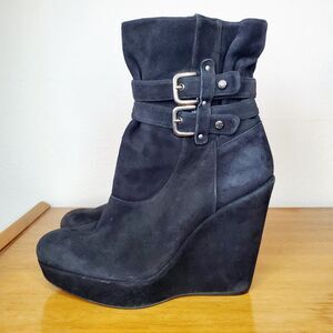 Stuart Weitzman WedgeHolster Black Suede Ruched Buckle Booties Fall Ankle SZ 9