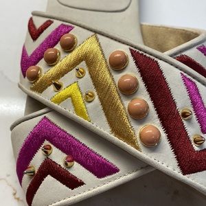 Leather slides and soles, unique and colorful embroidery, spikes and embellishments