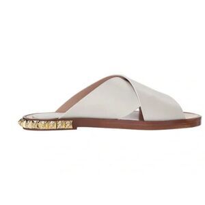 Elegant white sandals with criss-cross design. Features gold studded accents on the heel. Perfect for stylish outings.