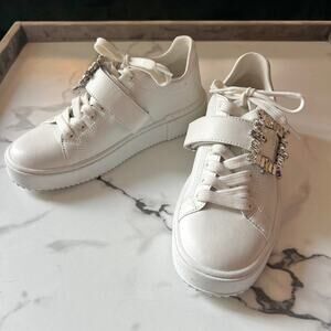 Stuart Weitzman white shine buckle sneakers. Lace-up. Flat heel with a rounded toe. Low top. Crystal embellishment buckle on both shoe. Leather outer and insole, rubber outsole. In overall great condition, very minor signs of wear. Size 6 (36.5).
