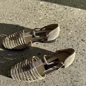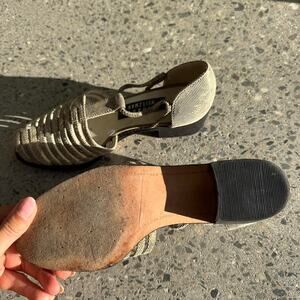 woven leather shoes, retro summer heels, strappy closed toe sandals, Stuart Weitzman vintage, slingback peep toe, neutral shoes, comfortable vintage heels, designer summer shoe, boho city