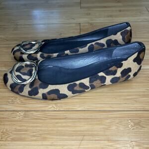 Stuart Weitzman Women’s 7.5 Leopard Kitten Heel Wedge Calf Pony Hair Gold Detail