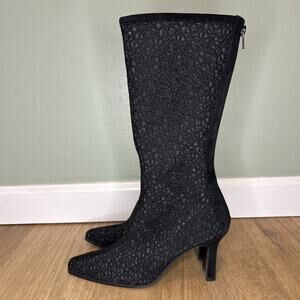 Chic and unique Stuart Weitzman lace cutout boots — the perfect blend of elegance and edge. These statement boots feature an intricate black lace overlay, pointed toe, and mid-calf silhouette with a sculpted block heel. Ideal for cocktail parties, date nights, gothic-inspired fashion, or elevated evening looks.