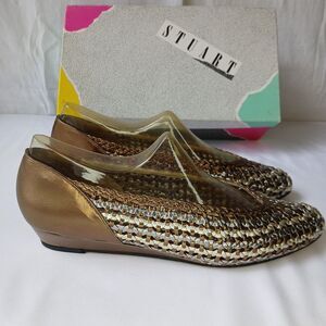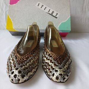 Stuart Weitzman Womens 8 AAA Leather Gold Cross Weave Flats Vintage 80s In Box