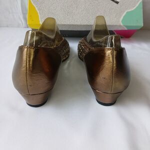 These vintage 80s Stuart Weitzman women's leather gold cross weave flats are a stylish and lightweight option for various occasions such as travel, weddings, parties, and formal events. With a slip-on closure and round toe shape, these flats offer comfort and breathability with a fabric insole. The AAA shoe width and leather outsole ensure a high-quality and unique designer shoe that exudes retro charm and elegance. Perfect for adding a touch of glamour to any outfit, these flats are a timeless addition to any shoe collection.