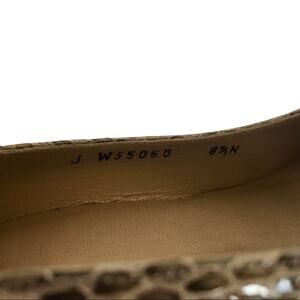 These incredible heels are perfect for a multitude of occasions! They are made of a patent leather in a textured snakeskin pattern and feature a rounded toe. Colors are a golden tan with cream color pattern. Although there is wear on the soles of the shoes, the heels and the leather upper and insoles are in EUC and I cannot find any blemishes. See pictures for details and measurement of heel. Size printed on side is women's 8.5N.