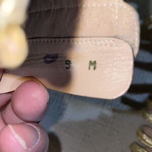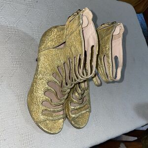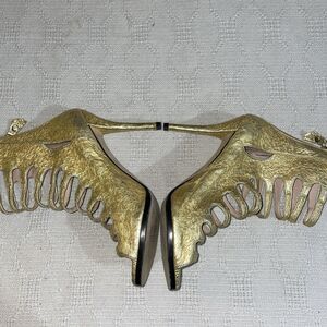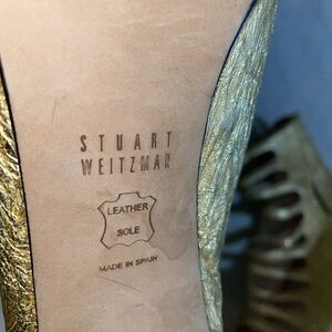 This womens gold leather pair of Stuart Weitzman dress heels has some fading on the gold. Still looks great!