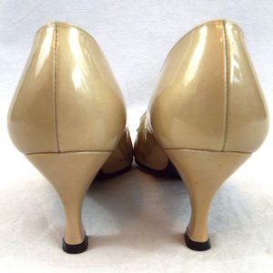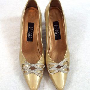 Stuart Weitzman Women's Gold Patent Leather Pointed Toe Heel w/ Bow Detail Sz 8W