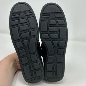Keywords: Stuart Weitzman flats, women's slip-on shoes, black suede flats, fur trim shoes, comfortable women's shoes, stylish flats, round toe flats, elastic strap shoes, pre-owned Stuart Weitzman, women's size 9 shoes, suede leather flats, sturdy rubber sole shoes, padded insole flats, Leanto model shoes, women's black flats