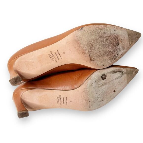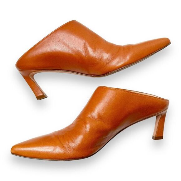 Leather: Cowhide. Mules. Stiletto heel. Pointed toe. Branded insole. Rubber heel patch at leather sole. Made in Spain. Style #STUAR20863. A sculpted heel in chestnut cognac brown, make these Stuart Weitzman mules a sophisticated addition to any outfit. Pair them with tailored pants or distressed jeans, this slip-on style can go with anything.