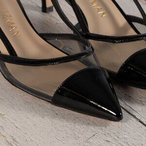 The Stuart Weitzman Women's Mondrian 50 Slingback in black/flannel, size 8B, is a stylish and versatile heel perfect for various occasions including travel, weddings, parties, and casual or formal events. The pointed toe and clear PVC accents add a touch of elegance to the shoe, while the leather outsole and comfortable features make it suitable for all-day wear. With a kitten heel style and sleek patent leather upper material, this shoe is a celebrity-inspired choice that is sure to make a statement. Made in Spain, this designer heel combines fashion and comfort effortlessly.