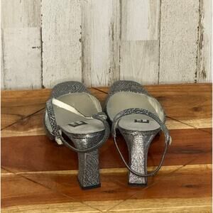 Keywords: Stuart Weitzman heels, silver strappy heels, women's block heels, open toe heels, mid heel shoes, formal occasion shoes, spring fashion heels, chic silver pattern, comfortable women's heels, pre-owned Stuart Weitzman, buckle closure heels, stylish women's footwear, silver-toned heels, women's formal shoes, elegant block heels.