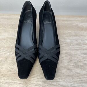 The product is a pair of Stuart Weitzman women's size 5 M black suede kitten heels with cross straps, made in Spain. These heels feature a pointed square toe shape, a low 1-1.9 inch kitten heel, a slip-on closure, and a moderate cushioning level. The black suede material, along with the strap accents, adds a stylish touch to these classic pumps, making them perfect for dress occasions. The brand's reputation for quality and design is evident in these elegant heels that combine comfort and fashion effortlessly.