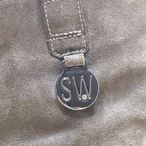 Soft slouch-style suede boots with shearling lining. Features mid-calf height, slip-on design, durable sole, metal SW logo charm, and stitched accents. Includes original box.