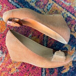 Stuart Weitzman | Women’s tan textured leather Bucalina heels. Faux tortoise shell toe buckle. Women’s size 7.5