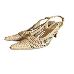 Step into understated elegance with these Stuart Weitzman woven slingback heels in a warm beige tone. Their raffia-inspired construction and pointed toe design exude vacation-ready sophistication, while the low kitten heel keeps them walkable and timeless. Perfect for brunches, beach weddings, or spring-to-fall events—these heels are an effortless way to save on style without sacrificing luxury.