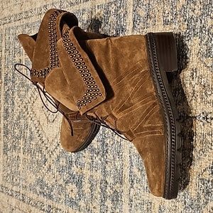 Unique lacing, studded foldover collar details, and a chain trimmed midsole create a suede boot you'll never want to part with.