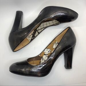 Stuart Weitzman almond toe patent leather pump in a black and olive tortoise shell pattern