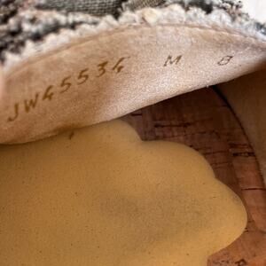 Animal print woven textile in the shape of a flower. Cork wrapped shoe. Half wedge style heel approximately 4”. Platform 0.5”. Anti slip pad on shoe, I couldn’t wear them without. Preowned, in great condition with minimal signs of wear on soles.