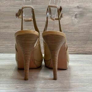 Stuart Weitzman beige patent leather ankle strap platform open toe heels size 8