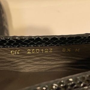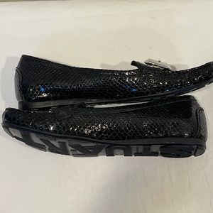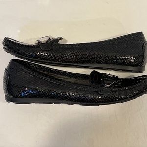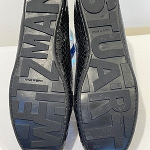 Stuart Weitzman black driving Moc with a faux snakeskin patent leather finish, silver buckle accents.